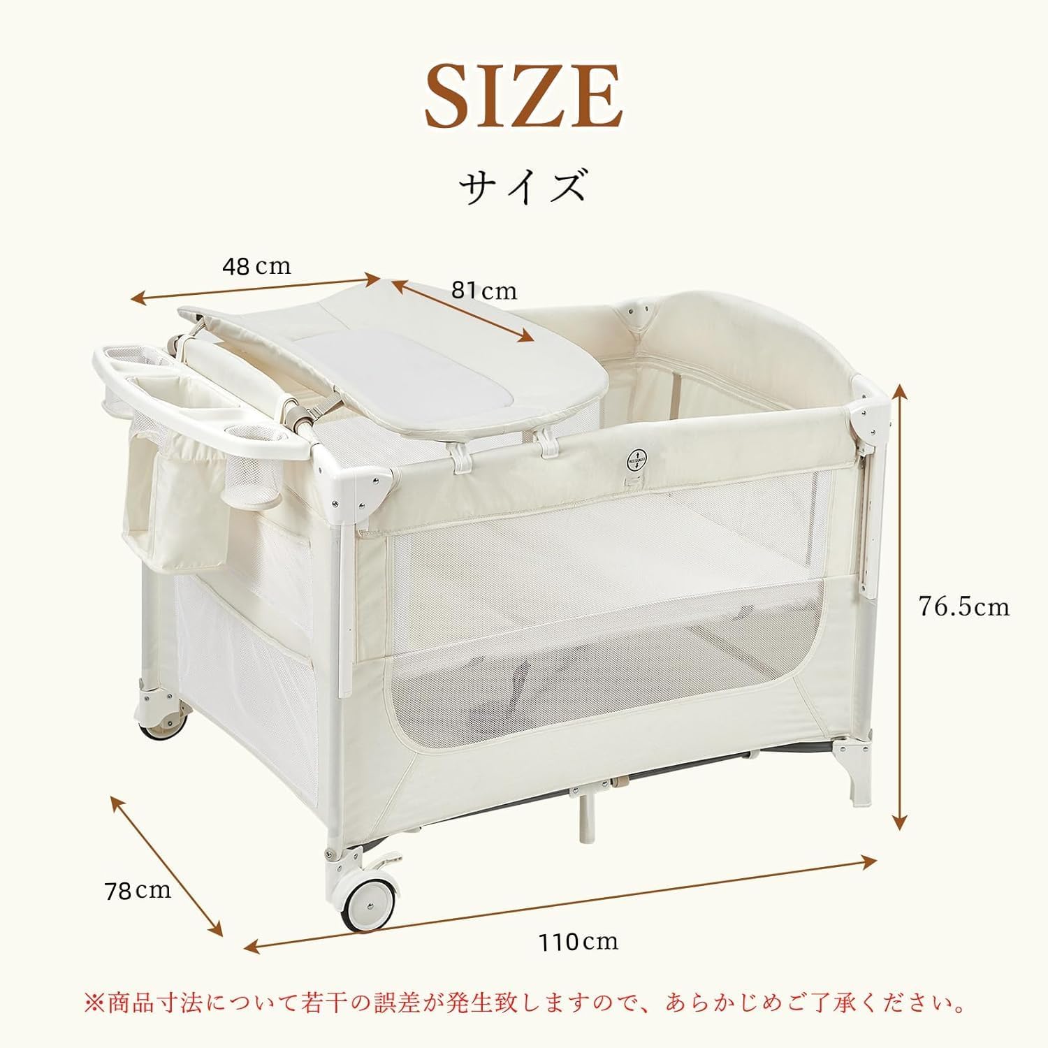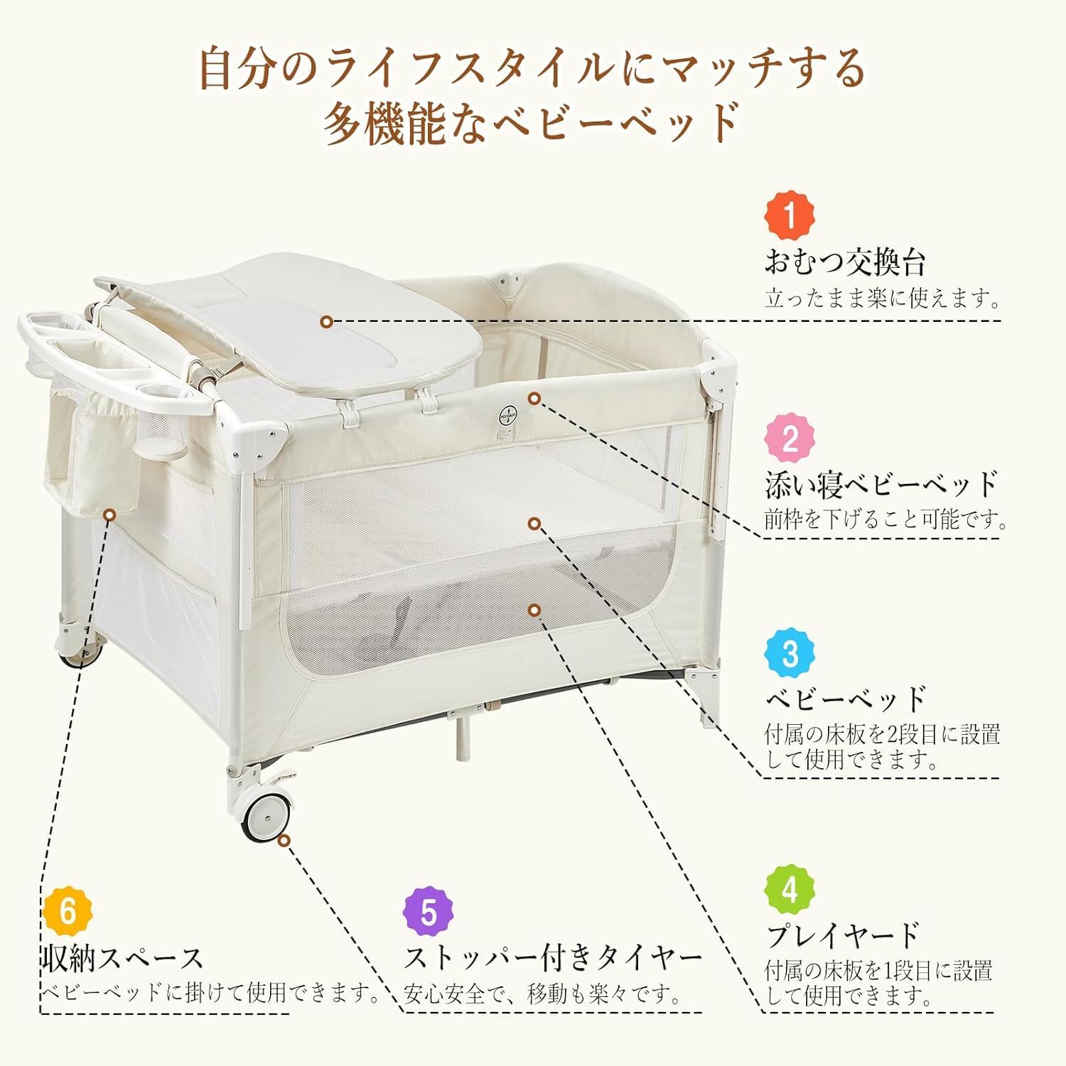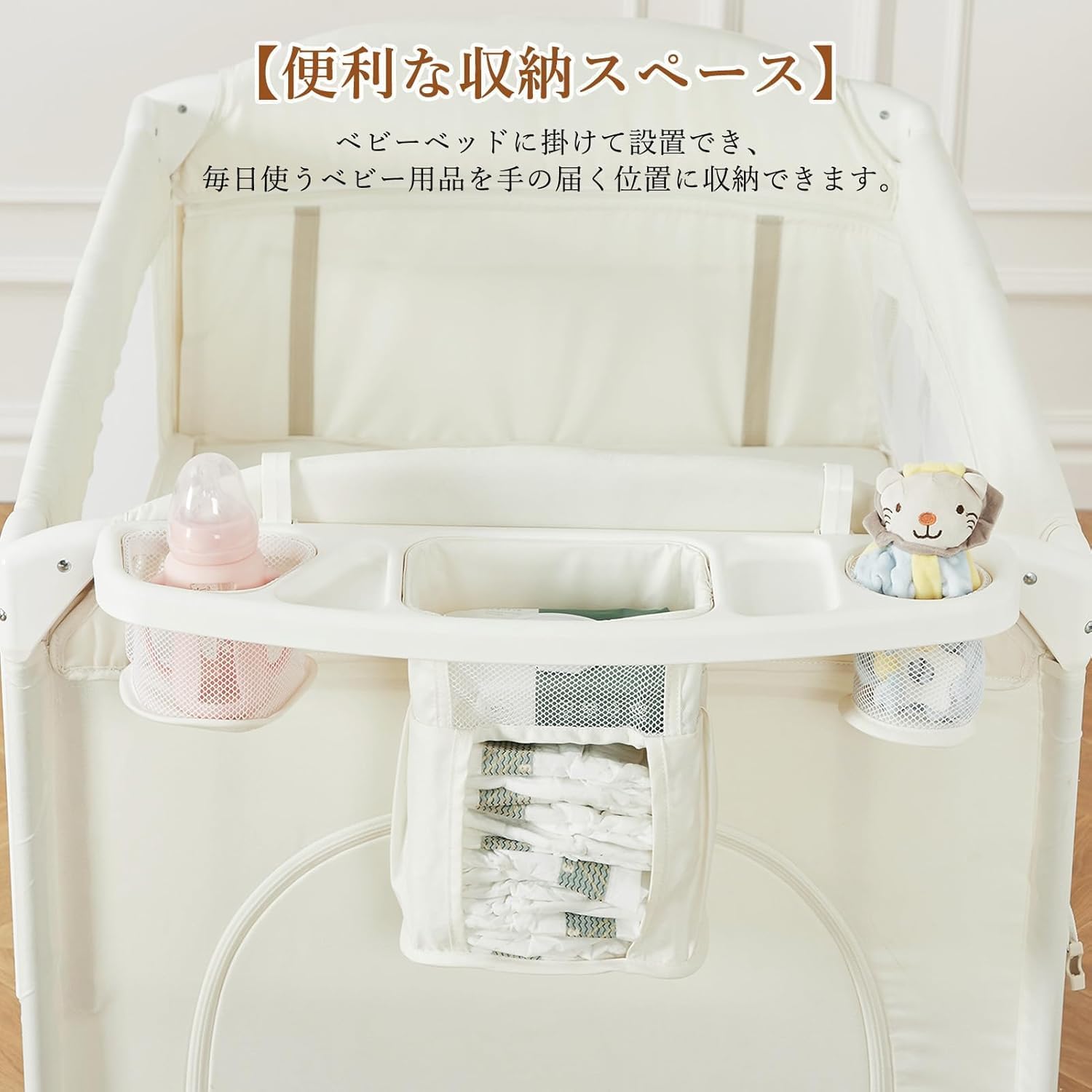 - 【たっぷり収納スペース】ベッド下にはオムツや布団などのケア用品を収納できるスペースを完備。本体サイドの収納ボックスは、哺乳瓶、おむつやウェットティッシュをすぐに取り出せてとても便利です。