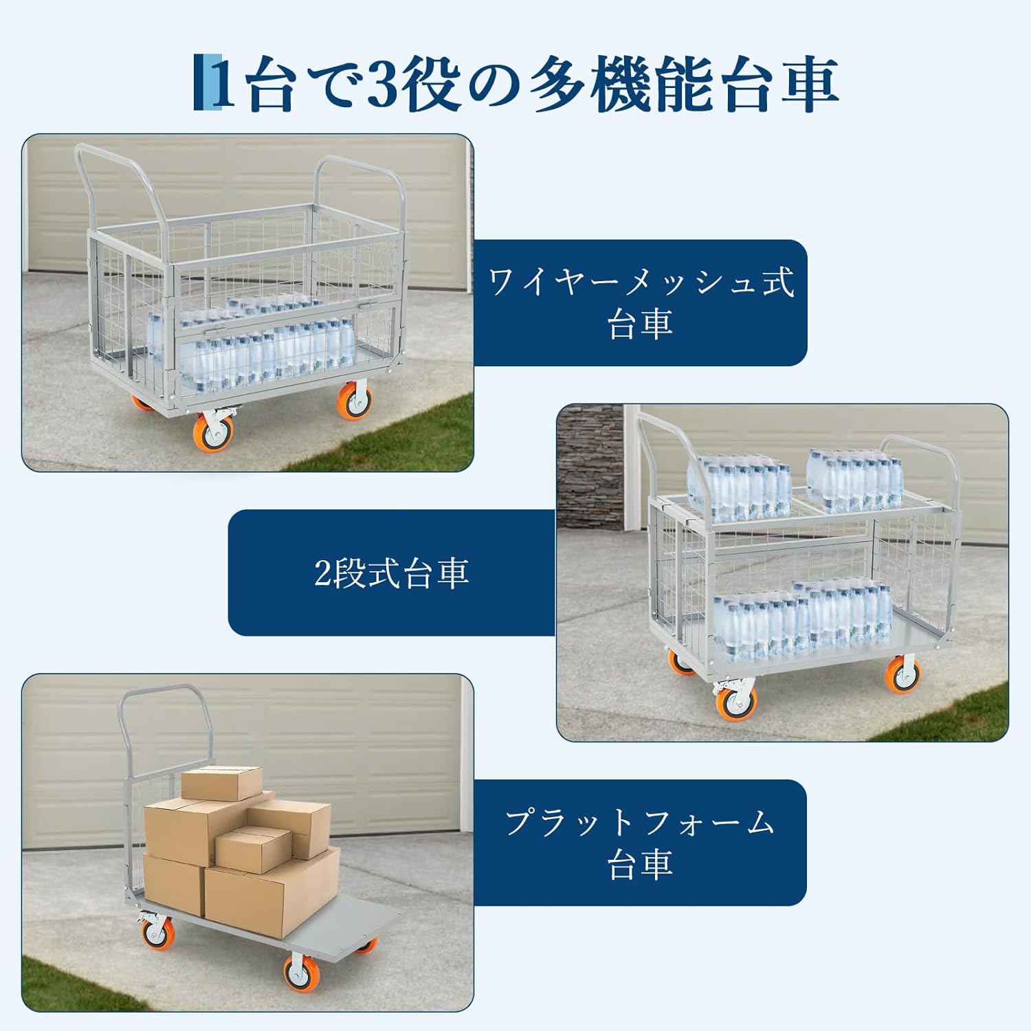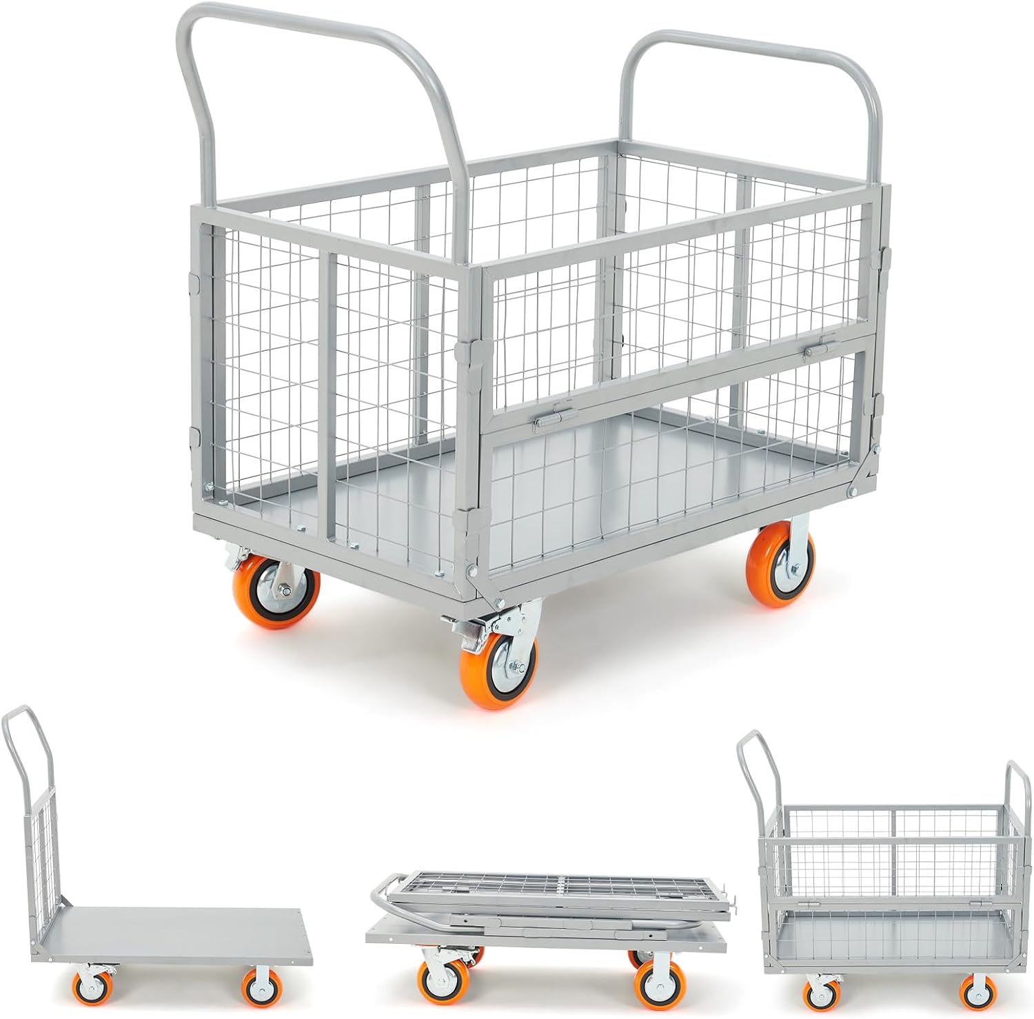 - 【変形可能·1台3役】脱着式メッシュパネルとサイトオープン設計、簡単に操作できます。自在に変形により、ワイヤーメッシュ式台車、2段式台車とプラットフォーム式台車として使え、様々な運搬ニーズに対応可能で、作業効率を向上させます。