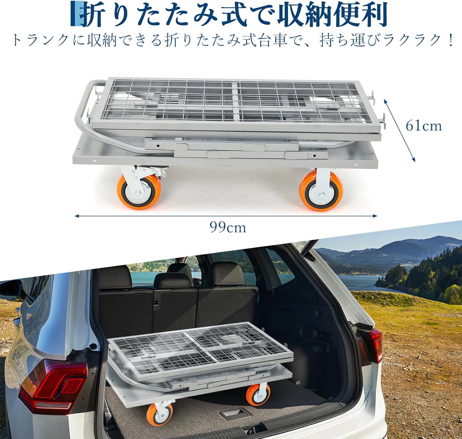 - 【折りたたみ式·収納便利】メッシュパネルを外すと台車本体は折りたたみ可能です。メッシュパネルを荷台に載せれば、場所を取らずコンパクトに収納できます。
