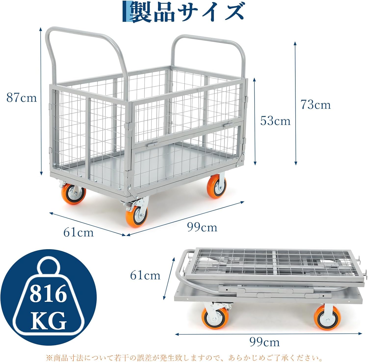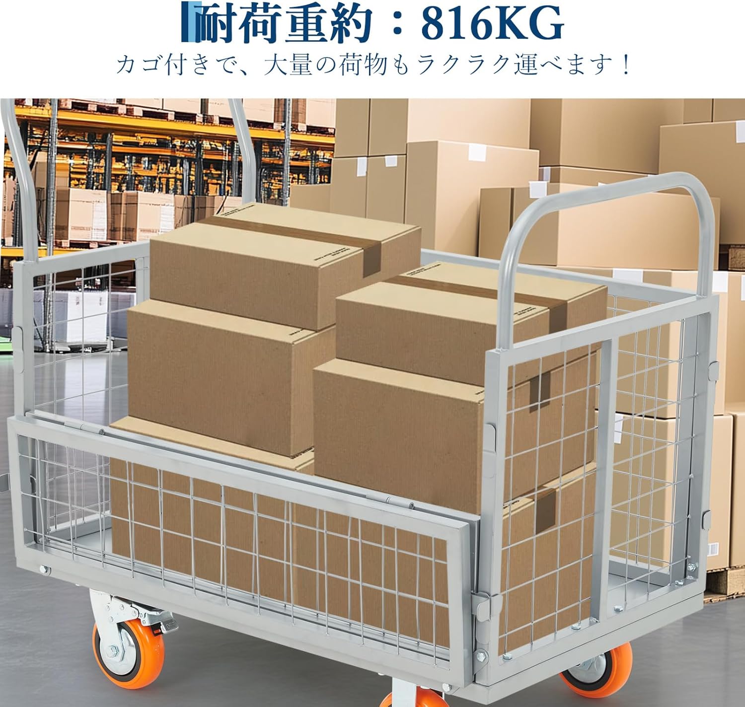 - 【頑丈・高耐荷重】台車のフレームはスチール製で、側面は高強度ワイヤーメッシュ構造です。耐久性に優れ、816kgの耐荷重を実現し、重い荷物も安心!