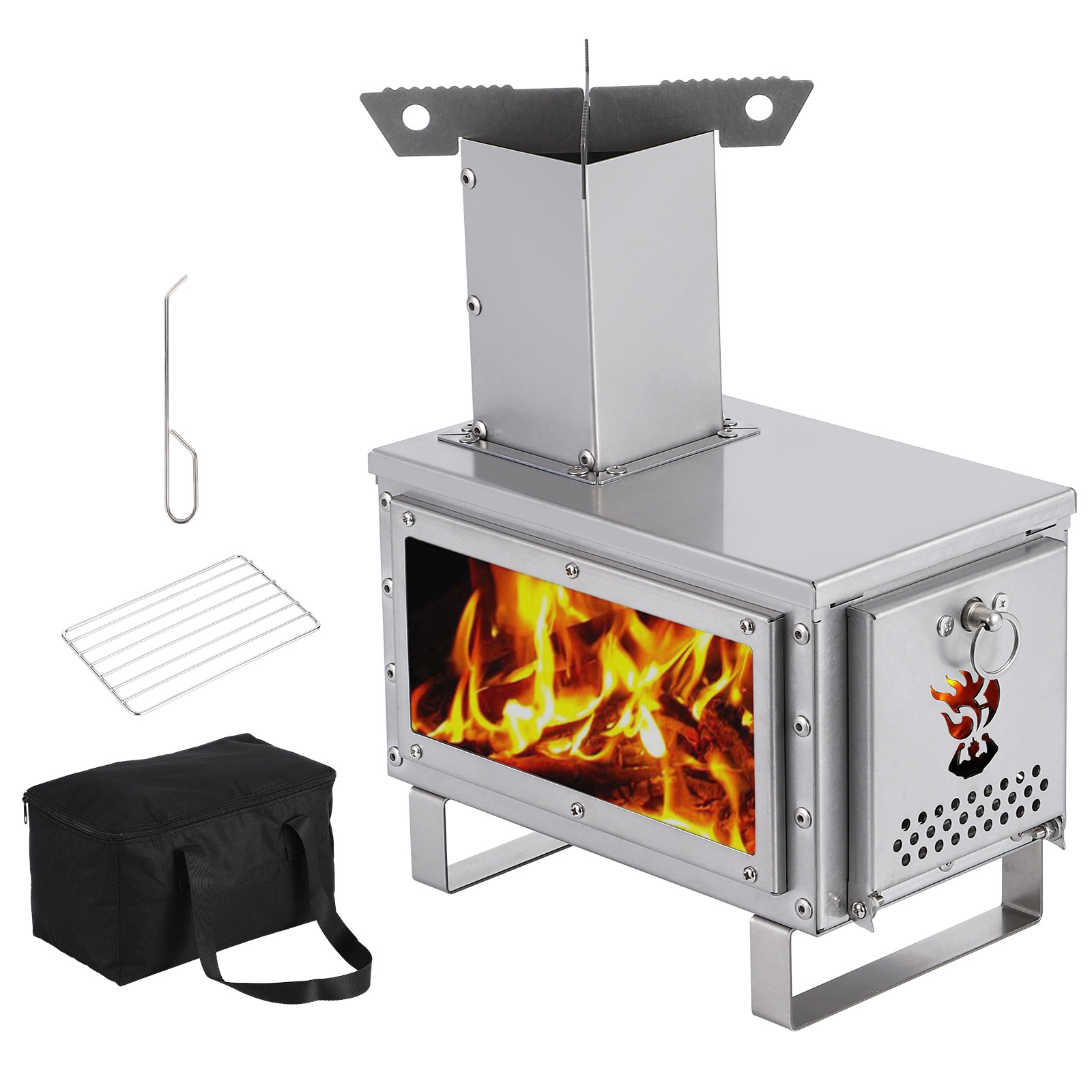 ロケットストーブ 薪ストーブ ステンレス 折りたたみ 小型 軽量 耐熱ガラス窓付 火格子付き 煙突と収納袋付き キャンプ ウッドストーブ 携帯便利 焚き火台 BBQ
