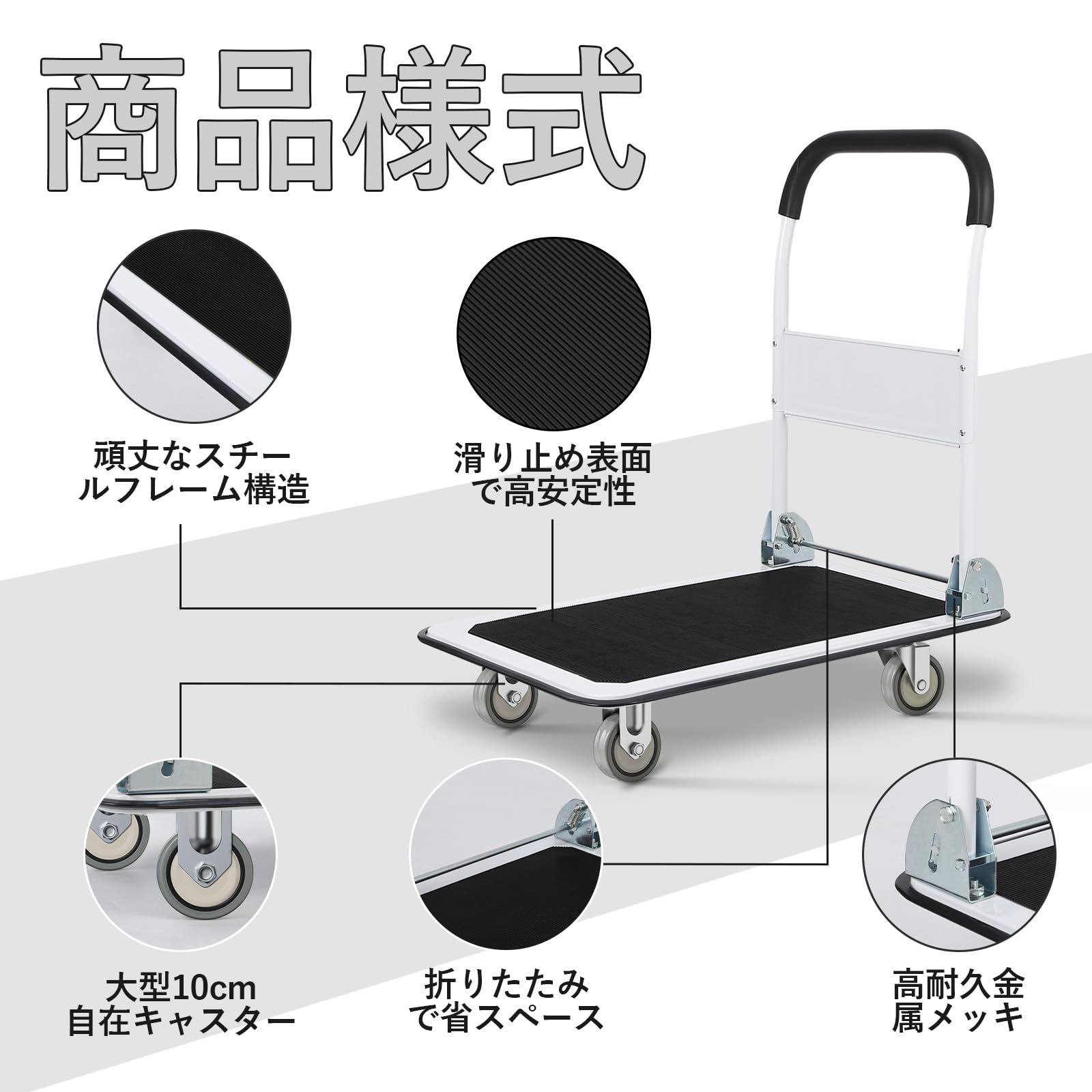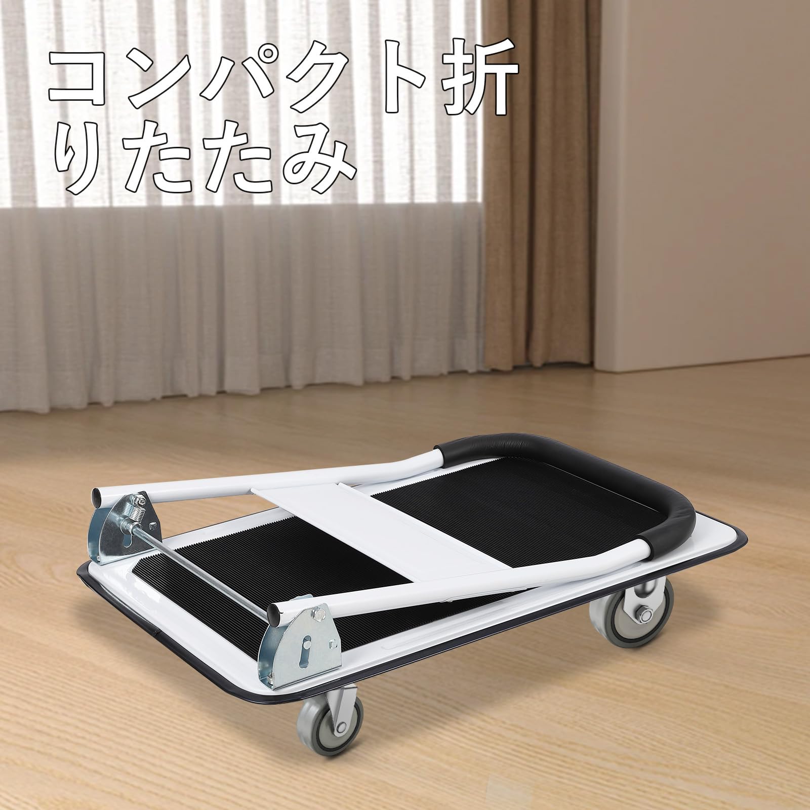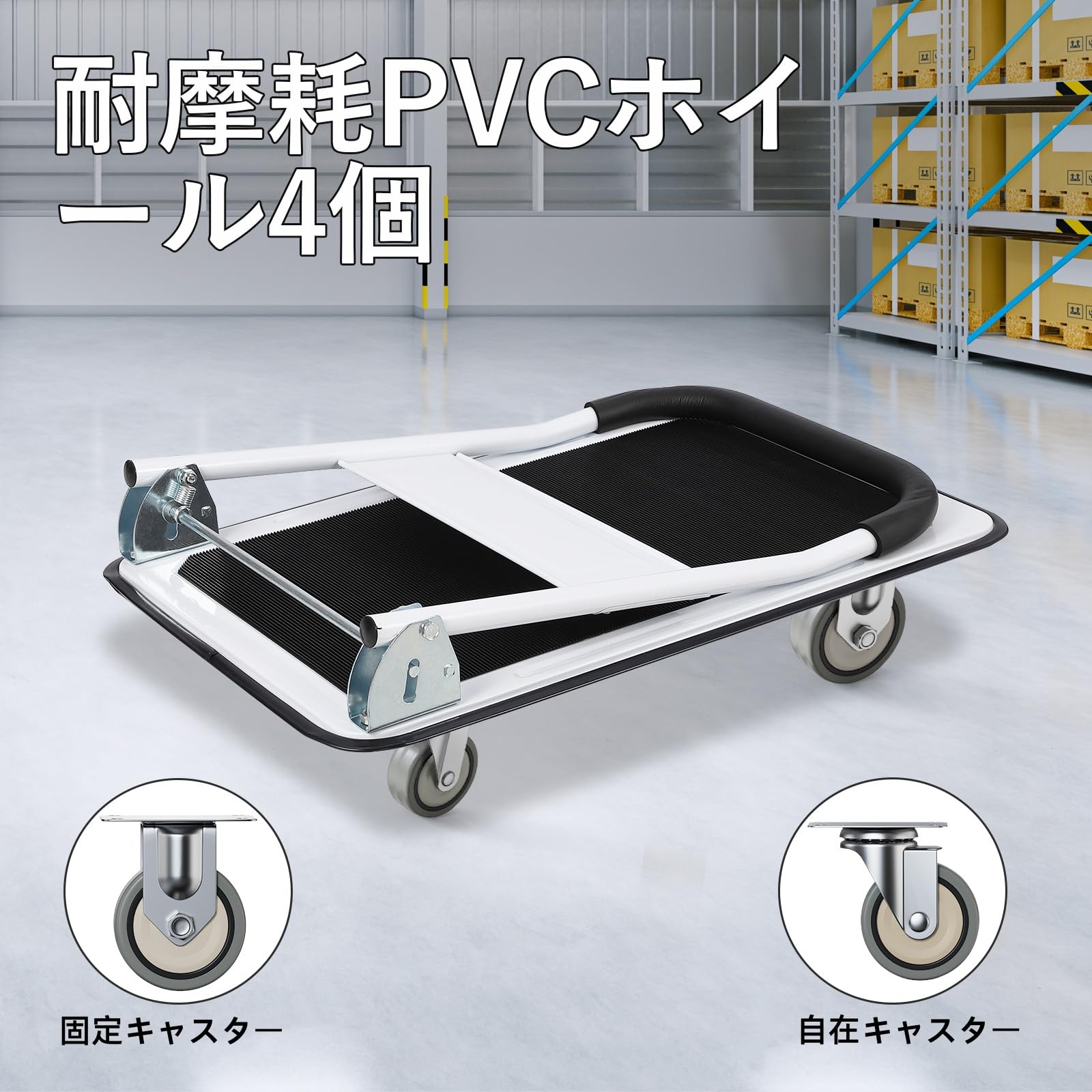 耐荷重150kgの台車、重い荷物もラクに運べるんです!キャスターが自由に回るので、狭い通路でも使いやすいです。