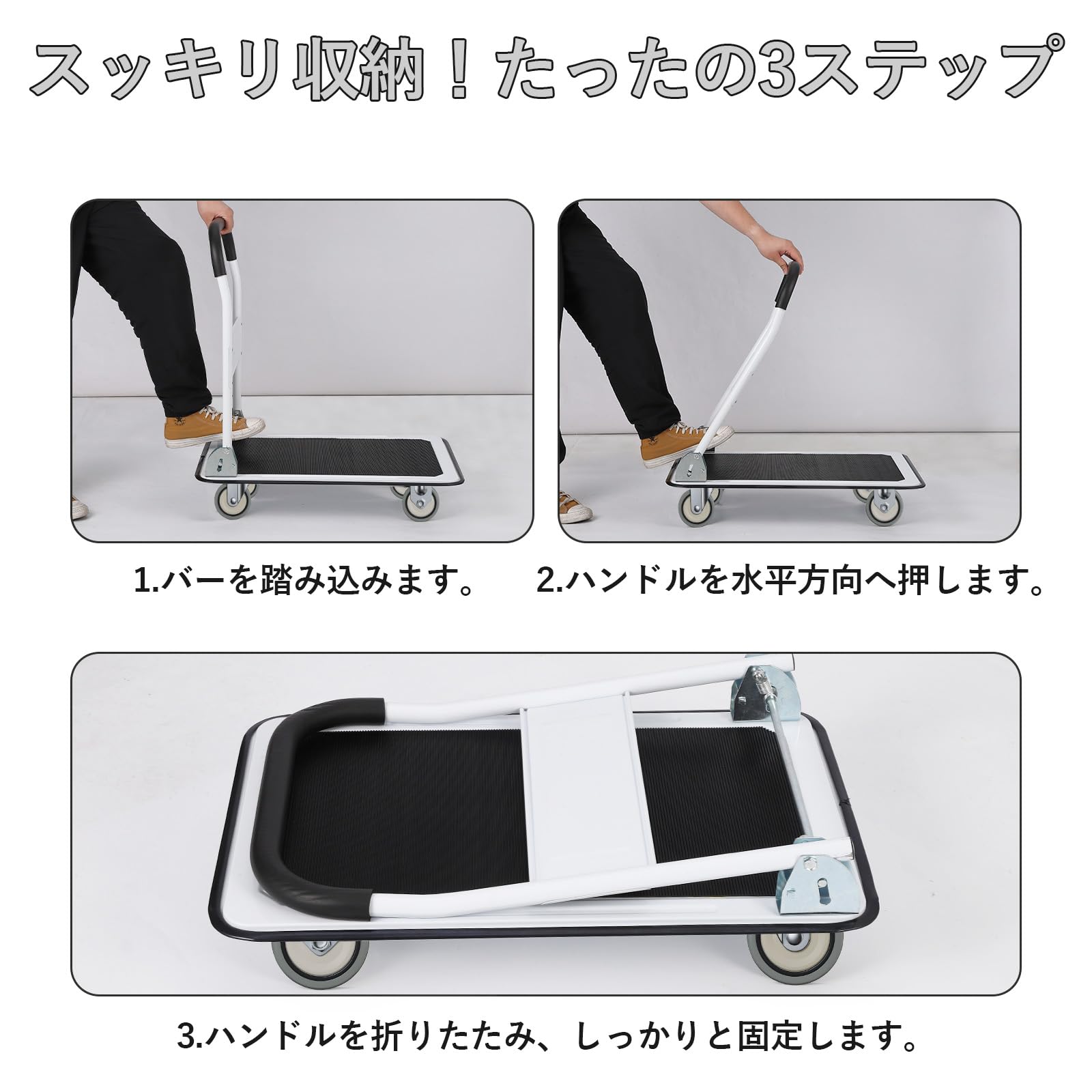 • 【簡単折りたたみ収納】折りたたみ式デザインにより、使用しない時はコンパクトに収納でき、運搬時には大型荷物にも対応可能。日本語の説明書付きで、初心者でもスピーディに収納可能。簡単3ステップでコンパクト収納可能:① バーを踏み込みます。 ② ハンドルを水平方向へ押します。 ③ ハンドルを折りたたみ、しっかりと固定します。