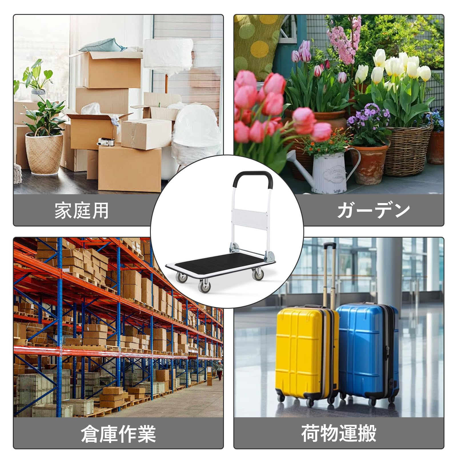 • 【多様なシーンで活躍】静音性・大容量・耐荷重・安定性を兼ね備えたこの台車は、様々なシーンで活躍します。オフィスでの荷物運搬、引越し作業、買い物など、多様な場面でご利用いただけます。業務用から個人使用まで、幅広くお使いいただける優れものです。